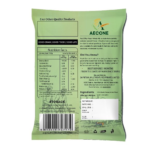 Aecone Khapli Wheat Flour is made from carefully selected ancient Emmer (Khapli) wheat and stone ground to retain its natural goodness. Known for its traditional purity and nutritional value, Khapli wheat is valued for its higher fibre content and slower digestion compared to modern wheat. This flour is suitable for preparing soft, tasty rotis and everyday meals, making it an ideal choice for those seeking wholesome and traditional nutrition.