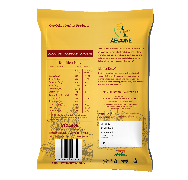 It is suitable for regular consumption and fits well into balanced daily diets. Aecone Sooji should be stored in a clean, cool, and dry place, and once opened, kept in an airtight container to maintain freshness. The product has a shelf life of 3 months from the date of manufacturing.